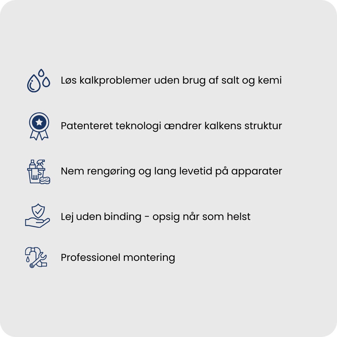 Med LAGUR Home slipper du for kalkgener i hele hjemmet – uden kemikalier, salt eller spildevand. Monteres af autoriseret LAGUR VVS-partner og virker med det samme. Der er ingen binding, opsig lejeaftalen når som helst - du ejer anlægget efter 60 måneders leje.