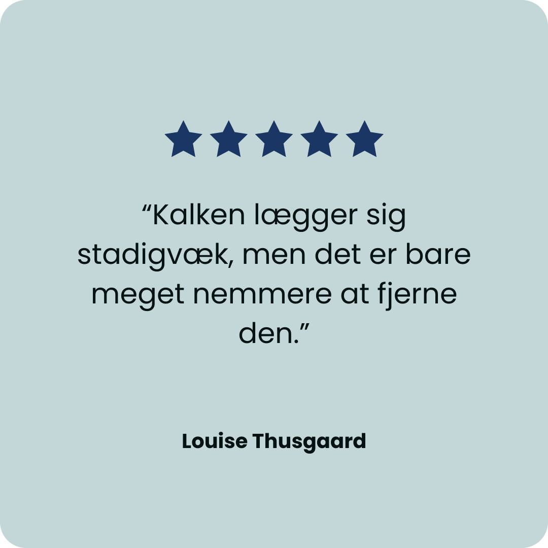 Selvom dansk vand er sundt og rent, indeholder det ofte meget kalk. Kalk sætter sig som hårde belægninger på fliser, armaturer og glas - og det slider både på husholdningsmaskiner og rør.